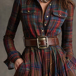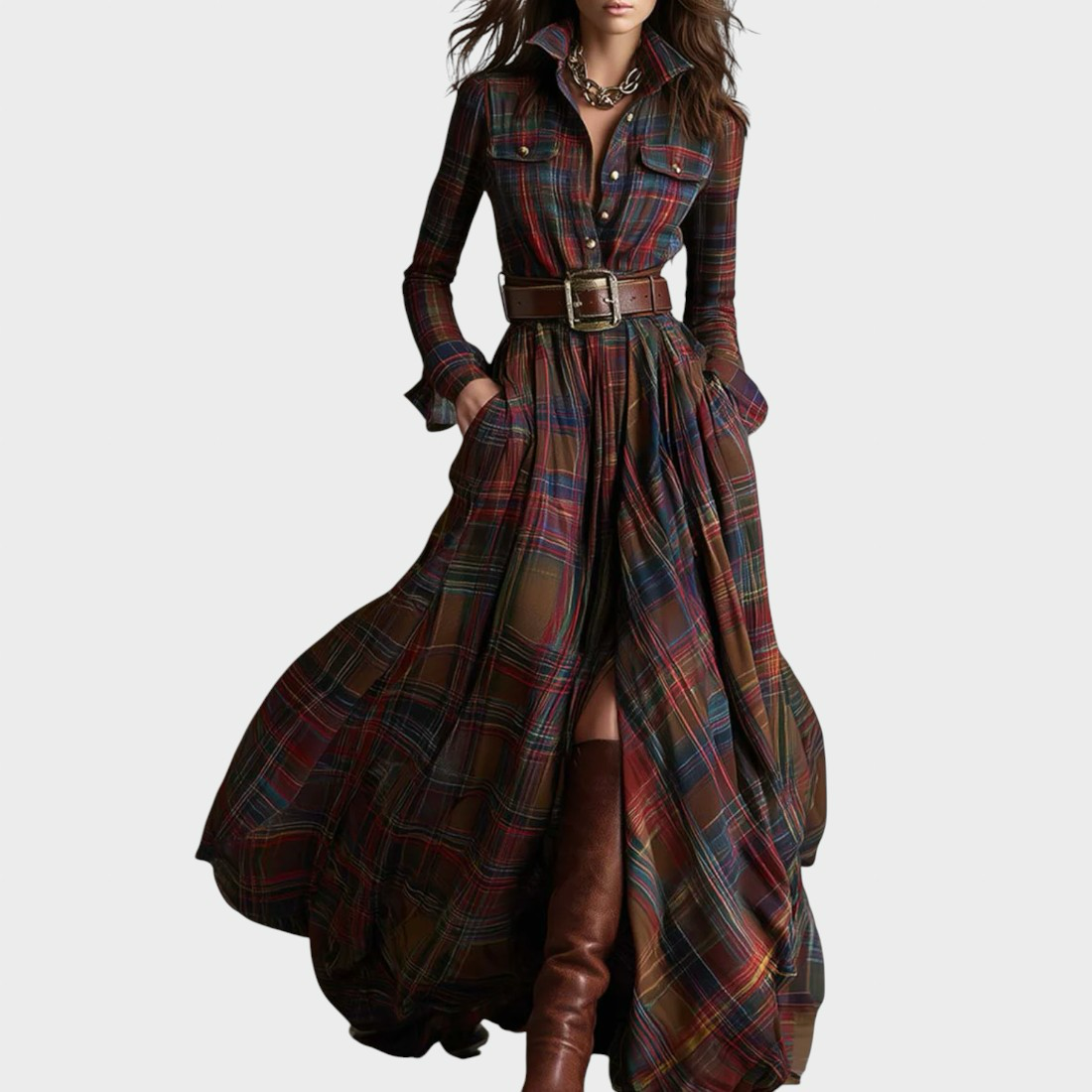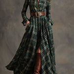 Ova maxi haljina nadahnuta vintage i etno stilom ima rever dizajn i karo uzorak u crvenkastom-smeđoj boji, besprijekorno spajajući retro šarm s toplim etno detaljima za bezvremenski i upečatljiv izgled. Uski kroj pojačava eleganciju, dok bogati karo uzorak dodaje slojevitu, nostalgičnu notu.
