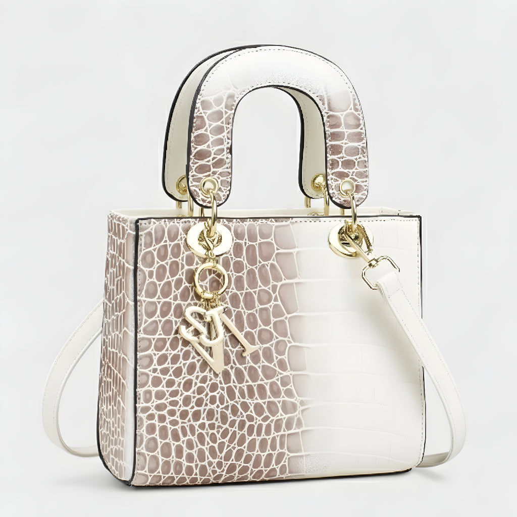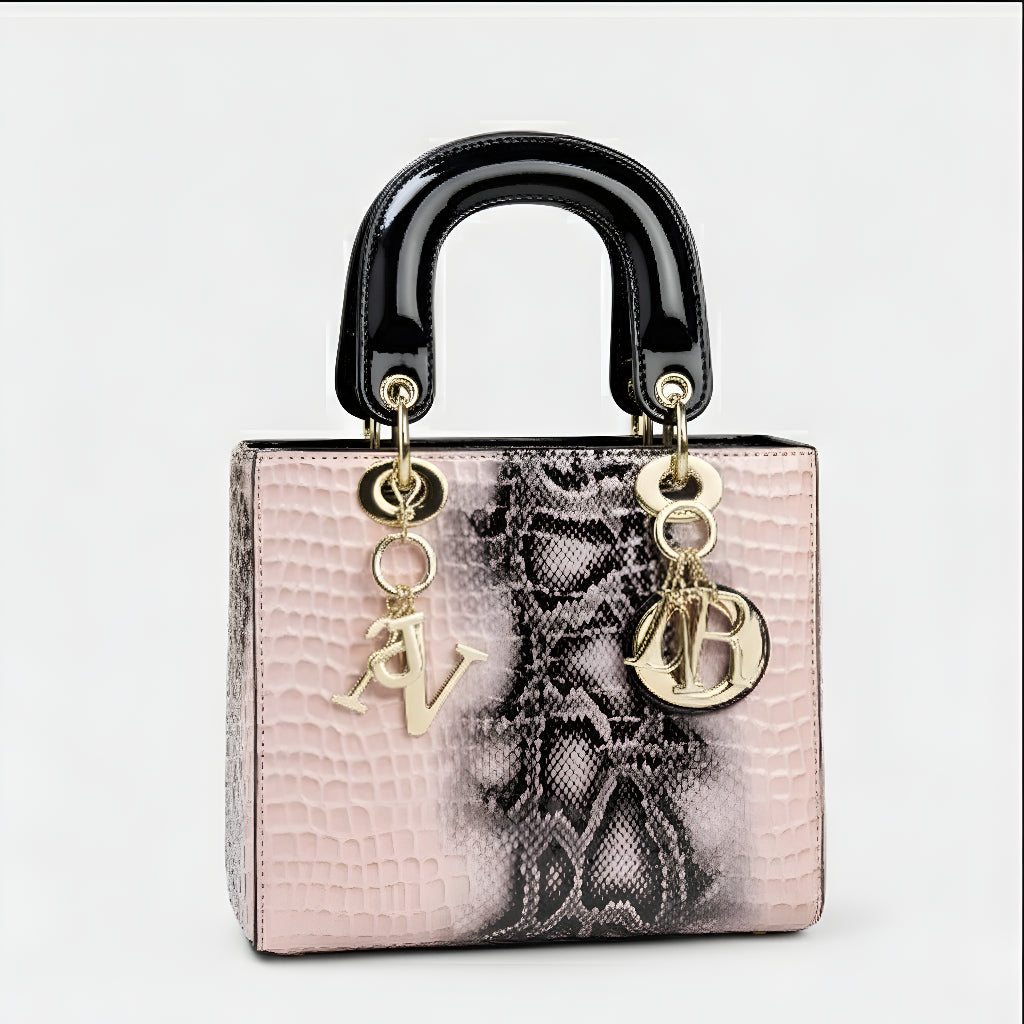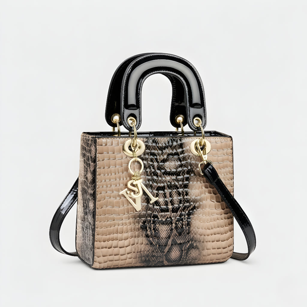 Sa sofisticiranim završetkom u životinjskoj teksturi i metalnim dijelovima visokog sjaja, ova torba je definicija profinjenosti. Strukturirana, s dvostrukim ručkama i dugom uklonjivom trakom, nudi svestranost koja odgovara od formalnih događaja do ležernih trenutaka sa stilom. Aksesor koji trenutno podiže svaku kombinaciju, donoseći šarm i autoritet.